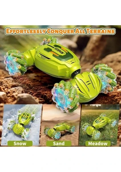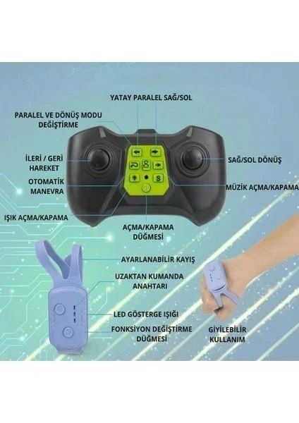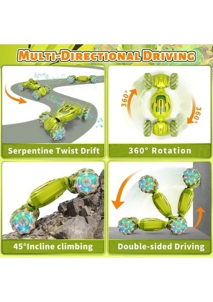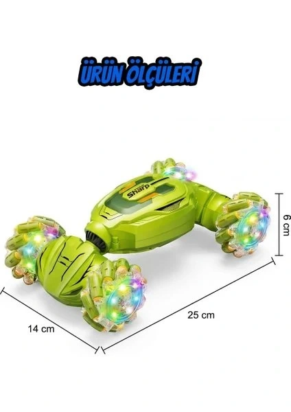 Işıklı Şarjlı El Sensörlü Bilekten Kontrol 2.4 Ghz Şarjlı Uzaktan Kumandalı 360° 4x4 Akrobat Araba Geleneksel uzaktan kumanda yöntemlerinin aksine, bu araba gelişmiş hareket algılama özelliğine sahiptir. Çocuklar arabayı basit el hareketleriyle kontrol edebilir, bu da onu benzersiz ve heyecan verici bir oyuncak haline getirir. Çok Yönlü ve Dönüştürücü Tasarım: Araba, çeşitli arazilere uyum sağlamak için iki farklı forma dönüşebilir. Yanal hareket ve kıvrımlı dönüş gibi özellikleriyle, çocukların ilgisini çeken dinamik bir sürüş deneyimi sunar. Dayanıklı ve Güvenli Yapı: Geri dönüştürülebilir ABS malzemeden üretilen ve BPA içermeyen bu uzaktan kumandalı araba, uzun ömürlü olacak şekilde üretilmiştir. Sağlam tasarımı, zorlu oyun koşullarına dayanacak şekilde tasarlanmıştır ve uzun süre favori oyuncağınız olarak kalmasını sağlar. Etkileyici Performans ve Özellikler: 4x4 özelliğiyle donatılan araç, 360° dönüş ve çift taraflı sürüş gibi karmaşık hareketleri destekler. Tam dolu şarj ile yaklaşık 25 dakika çalışma süresi ve 2,4 GHz parazitsiz uzaktan kumandayla kolay kontrol özelliğiyle istikrarlı bir performans sunar.