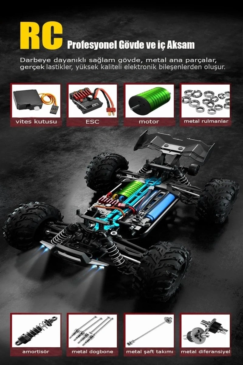 Profesyonel RC Uzaktan Kumandalı Araba 4WD 1:16 Metal İç Aksam 70km/H Şarjlı 4x4 Model Araç