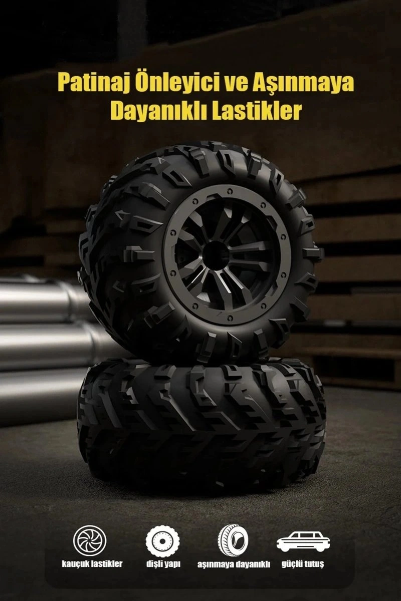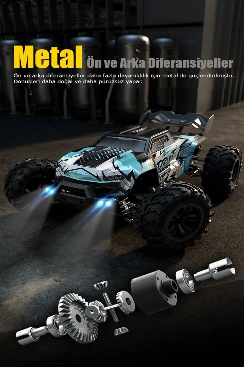 2.4GHz radyo kontrol kumanda ile entegre çalışır.70 km/hvaran hızda, ister parkurda, pistte, ister arazide kullanabilirsiniz. ; Dahili fırçasız motor, elektrik enerjisini maksimum gücedönüştürerek, yüksek hız ve yüksek performans sağlar. ; Radyo kontrol sistemi,açık alanda 100metreye varan çekim gücü ile, anti frekans sistemi ile sorunsuzbir şekilde yan yana yarışabilme imkanı sunar. ; Dört tekerlekte bağımsızsüspansiyon sistemi, full metal iç aksamı ile uzun ömürlü ve tam performans ilekullanım imkanı sunar. ; Gövde malzemesi darbe emici pvc malzemeden üretilmiştir.LED farlar ile donatılmıştır. ; Üç hız modu mevcuttur. ; Metal amortisörler ilegüçlendirilmiş, dört anti patinaj destekli lastikler ile kararlı bir sürüşdeneyimi yaşatır. ; Plaj, kar, çim, toprak, taş yollarda kullanıma elverişlidir. ; 1:16 ölçek, 30 x 23 x 11,5 cm boyutlarında. ; 3-3,5 saat şarjdolumu ile yaklaşık 20 dakika kullanım sağlar. ; 7.4V 1500mAh şarj edilebilir pilile çalışmaktadır. ; Kumanda 3 adet AA pil ile çalışır, dahil değildir.;